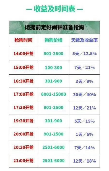 三、华登区块狗每只多少钱?华登区块狗每只的价钱在100至15000之间,每天下午开始分9个时间段可以抢9种狗:14:00点:卓登级别:卓越价值:901至2500之间收益:5天/12.5%15:00点:普登级别:普通价值:100至300之间收益:7天/21%16:30点:勇登级别:勇者价值:301至900之间收益:3天/9%17:00点:承登级别:传承金玺价值:6001至15000之间收益:20天/40%17:30点:卓登级别:卓越玉玺价值:901至2500之间收益:12天/21%19:30点:勇登级别:勇者价值:301至900之间收益:5天/15%20:00点:卓登级别:卓越价值:901至2500之间收益:1天/5%20:30点:稀登级别:稀有价值:2501至6000之间收益:7天/14%21:00点:稀登级别:稀有价值:2501至6000之间收益:12天/18%记得提前预约抢狗并设置好闹钟哦!