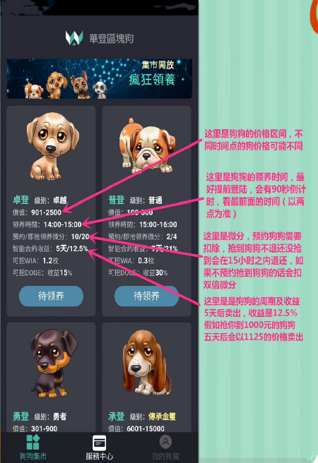 二、华登区块狗怎么玩?你可以在狗狗集市,注册认证并激活账户后,通过预约并匹配成功后支付押金领养你心仪的狗狗。一旦领养后,将区块写入**身份,可爱的狗狗进入“休息中”状态,休息中的狗狗不可以买卖,待智能合约到期后,狗狗将强制卖出。在狗狗集市场里成功领养了狗狗,不但可以得到合约的工资,还可以获得相应的狗狗币DOGE及等值的华登高通发行的珠宝链-华高链WIA。